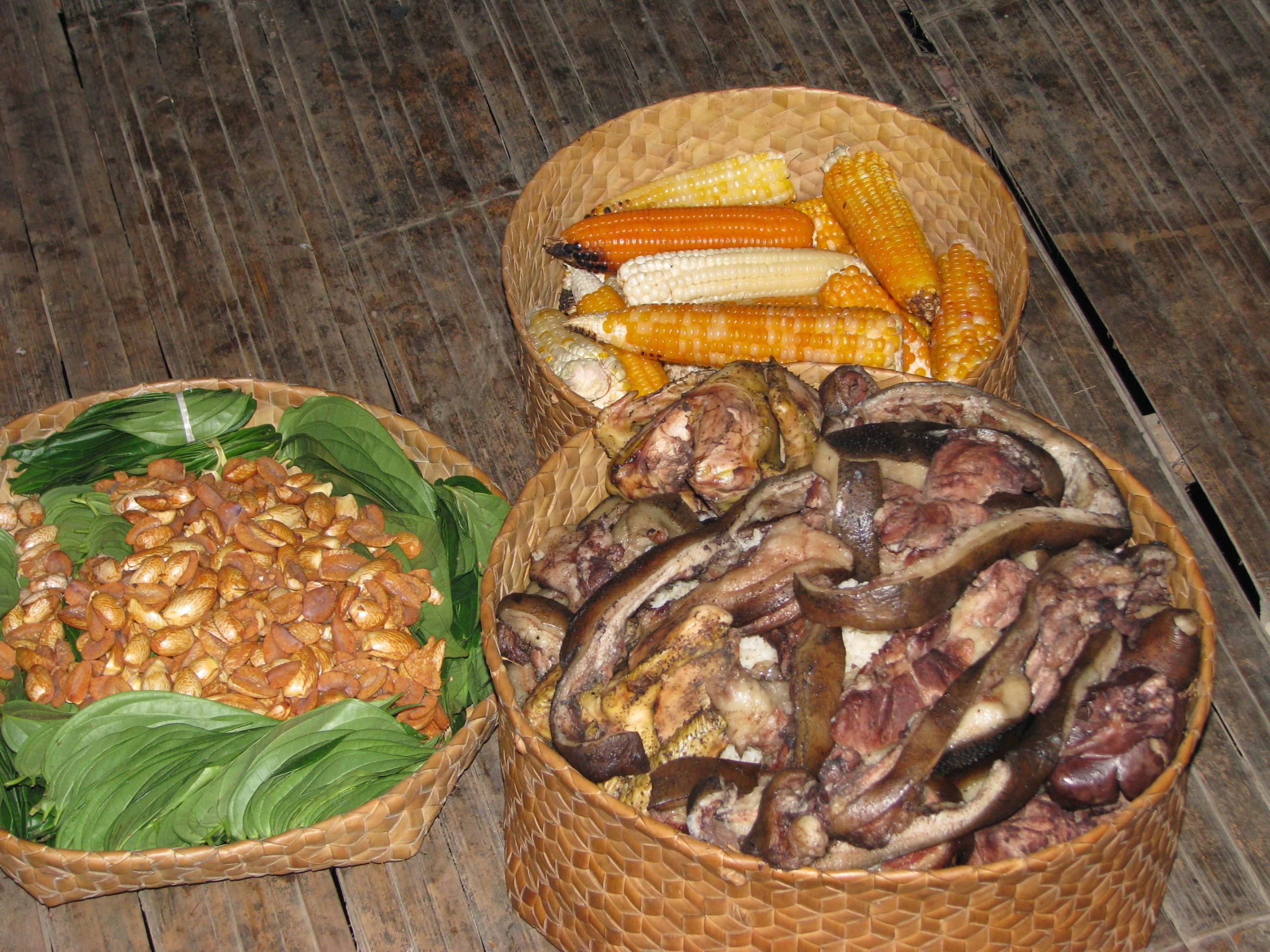 Na'an karau, batar no bua malus. Prepara hodi fó han ba bei'ala sira durante serimónia sau batar iha Foho Liurai, Babulo. Sau Batar ho lian Naueti dehan 'Nasi ekarae'. __________ Buffalo meat, corn, Areca nut and betel leaves. These items have been prepared as offerings to the ancestors in the course of a corn harvest ceremony on Liurai Mountain, Babulo. The word for corn harvest in Naueti language is "nasi ekarae."